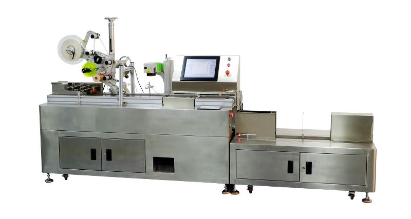 标识经客户确认后, 对应的数码存进计算机数据库, 标识有效, 同时计算机数据库系统与激光喷码机连接。产品通过分页头有序分开,贴标前电眼感应到产品,贴标机构进行贴标,贴标后,激光感应传感器感应到产品,激光机打码根据指令将商品身份码标识喷印在于标签或其外包装上。 在激光机激光后视觉检测激光效果,不合格的产品由剔除机构剔除,合格的产品通过计数电眼计数后,按一定数量分组,最后是由人工收产品。